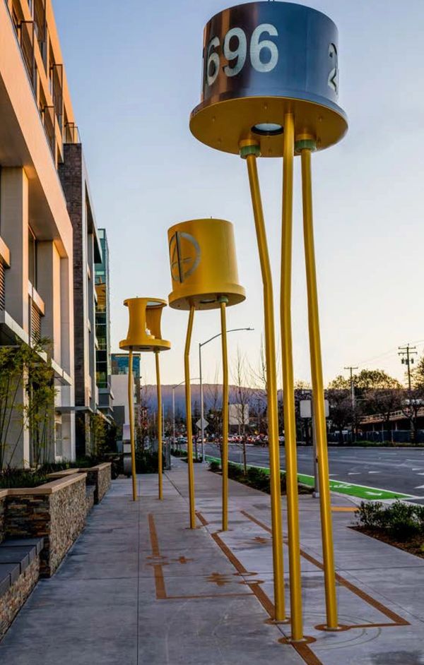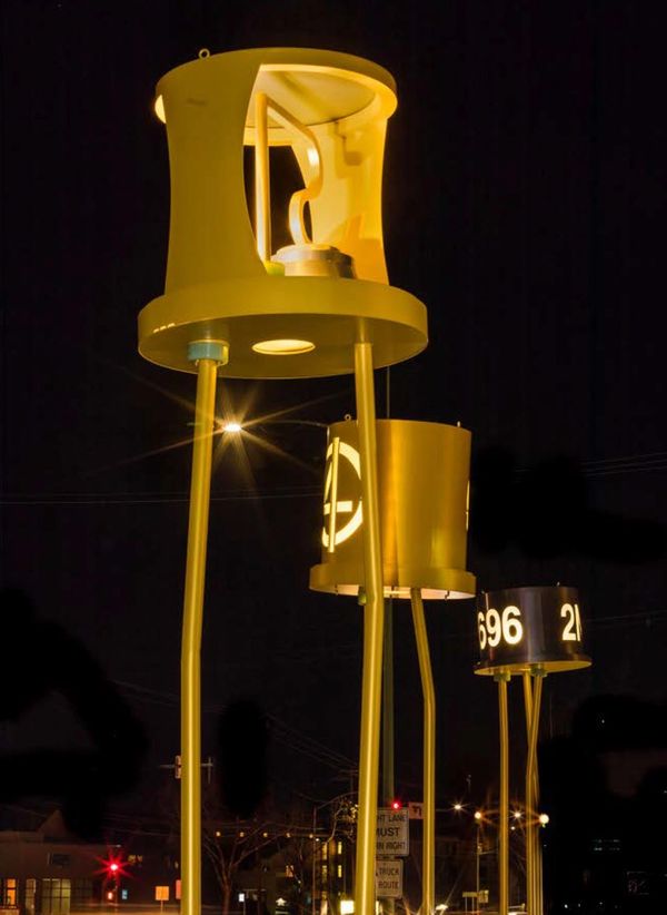 Three lit, powder coated steel, metal 18' x 4' x 18' sculptures with glass inserts, and terrazzo sidewalk.